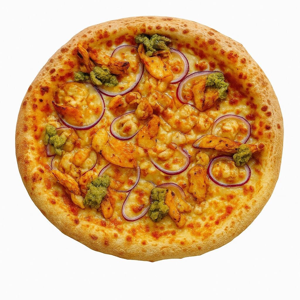 Tomatensauce, Mozzarella, rote Zwiebeln, Hähnchenfilet, Pesto, Tandoori-Hähnchen